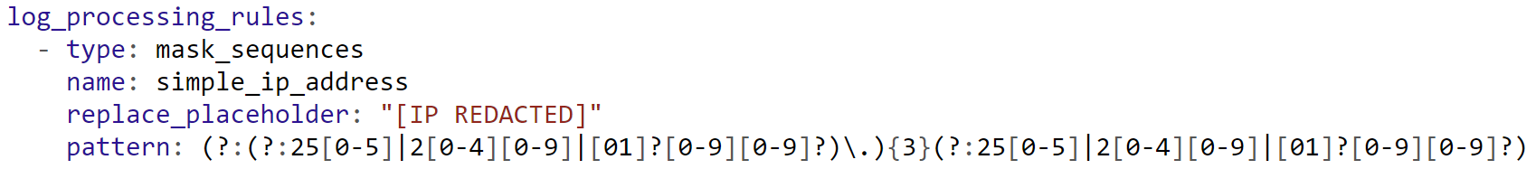 As an example, you may hide the IP address from the log entries by adding the following config to the DataDog agent with log collection enabled. We are using a python app and create a file conf.yaml in the conf.d/python.d/ directory with the following content: