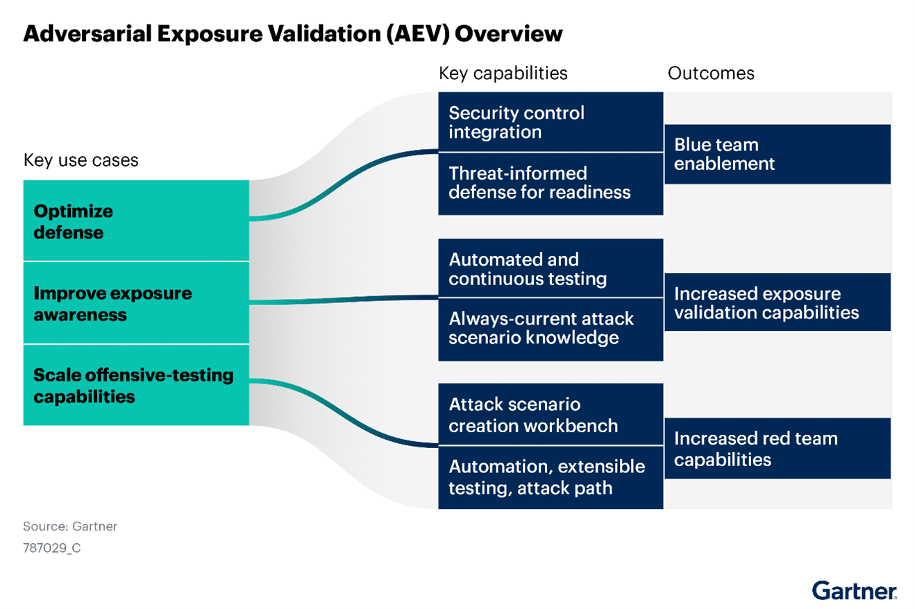 Adversarial Exposure Validation (AEV) technology helps organizations validate their defensive posture against attack scenarios and techniques. It enhances exposure awareness, improves attack scenario readiness, and supports continuous threat exposure management.